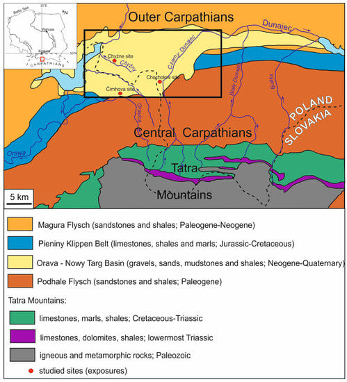 Geologically, the Orava Basin is a tectonic depression superimposed on three tectonic units of various age and geological history: The Pieniny Klippen Belt (Jurassic-Eocene rocks), the Magura Nappe (Cretaceous-lower Miocene flysch), and the Podhale Flysch (Eocene-Oligocene) [27,28,34,35,36,37,38,39,40,41,42,43,44] (Figure 2).