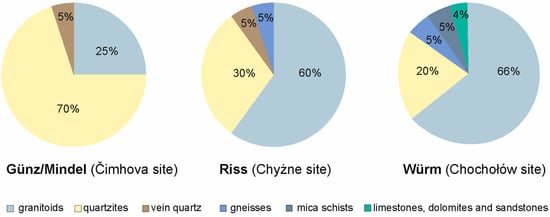 The middle fan was deposited during the Riss Glaciation (300–150 ka). These sediments are composed of coarse-grained clasts and gravels chaotically embedded in sand. The clasts decrease in size upwards and the material seems to be mostly (ca. 95%) derived from the Tatra Mountains [22]. The contribution of quartzite clasts (up to 30%) is lower than in the older sediments, while the proportion of granites, locally only slightly weathered, increases up to 60% [26]. Gneiss and vein quartz clasts complete their composition. Their contribution in the fan from the Riss Glaciation is up to 5% [26] (Figure 3). The thickness of gravels in this fan varies between 3 and 10 m [22].