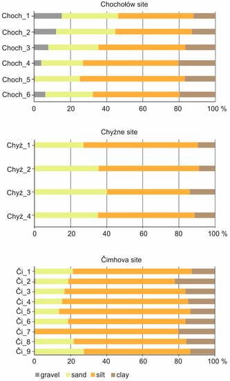 In the Chochołów site, the grain-size distribution is polymodal and characterized by negative skewness and poor or very poor sorting (Table 1). Silt-size grains dominate with the mean content of 48.4%. The content of the sand fraction is 27.5%, clay –16.3% and gravel –7.6% (Figure 4). The proportion of sand and gravel fractions diminishes toward the base of the section, respectively from 31.17% and 15.3% (Choch_1. depth 0.2 m) to 26.1% and 6.2% (Choch_6. depth 1.3 m). Furthermore, the content of silt-size grains increases from 41.4% at the top to 47.9% at the base (Figure 4).