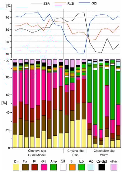 Heavy mineral assemblages in sediments of the uppermost (oldest) Günz/Mindel fan in the Čimhova site are generally composed of garnet (up to 43%), which is accompanied by ultrastable zircon (10–19%), tourmaline (13–30%), and rutile (15–27%). Other minerals occur in amounts usually not exceeding 3% each. The ZTR index (zircon + tourmaline + rutile; [73]) is rather moderate and reaches 54% on average. Very high here is also the GZi index (56–79%). The contribution of opaque minerals is rather moderate, with the mean value of 46% (Figure 5 and Table 2).