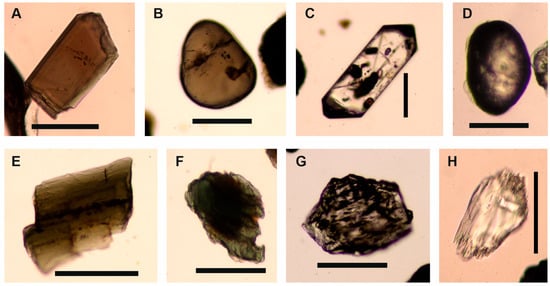 Examples of the morphologies and corrosion of the studied minerals: (A) euhedral tourmaline; (B) rounded tourmaline; (C) euhedral zircon; (D) rounded zircon; (E) uncorroded amphibole; (F) corroded amphibole with dissolution bays; (G) corroded garnet; (H) corroded apatite with hack-saw terminations. Scale bars are 0.1 mm.