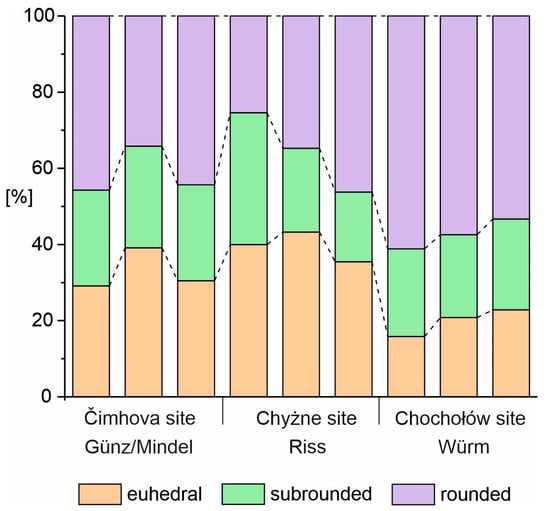 Three main zircon morphological types were distinguished within the zircon population: rounded, subrounded, and euhedral. Their distribution differs between the sampled deposits. Rounded and subrounded grains prevail in all studied samples. Euhedral zircon in the oldest deposits of the Čimhova site ranges from 29 to 39%, in the middle fan its contents are slightly higher (35–40%), while in the youngest Chochołów site the content of euhedral zircon is the lowest (16–23%) (Figure 7).
