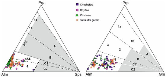Composition of garnets from the UHP/HP metamorphic conditions in the “pyrope-almandine-grossular” classification diagrams (according to Aubrecht et al. [74] and references therein; Méres et al. [75]): field A—garnet compositions from the UHP/HP conditions; field B—garnet compositions from granulite and eclogite facies conditions; field C1—transitional field of garnet compositions from high amphibolite to granulite facies conditions; field C2—garnet compositions from amphibolite facies conditions (this field includes also garnet from blue schists, skarns, serpentinites, igneous rocks, etc.). 1a—garnet from UHP eclogites, garnet—peridotites and kimberlites; 1b—garnet from UHP eclogites; 2—garnet from HP eclogites and HP mafic granulites; 3—garnet from HP felsic and intermediate granulites; 4—garnet from gneisses metamorphosed under P-T conditions transitional to the granulite and amphibolite facies; 5—garnet from amphibolites metamorphosed under P-T conditions transitional to the granulite and amphibolite facies; 6—garnet from gneisses metamorphosed under amphibolite facies conditions; 7—garnet from amphibolites metamorphosed under amphibolite facies conditions. Location of garnet spots from the Tatra Mountains based on analyses of Gawęda et al. [76] and Janák et al. [77,78].