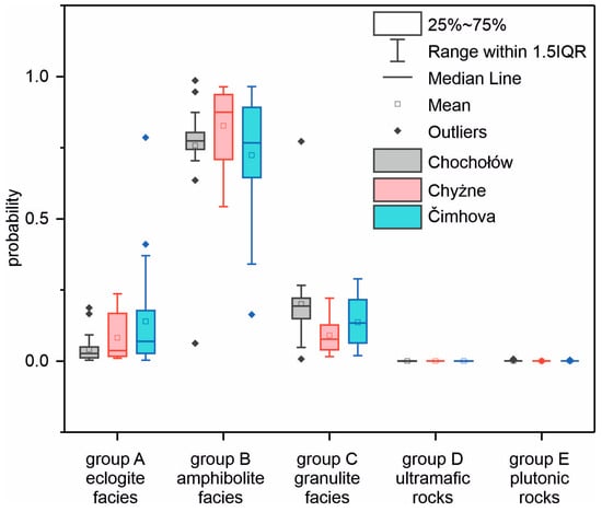 Box plot showing the distribution of the calculated probabilities for the studied garnet provenance regarding source rock and facies groups. Probabilities calculated according to Tolosana-Delgado et al. [71].
