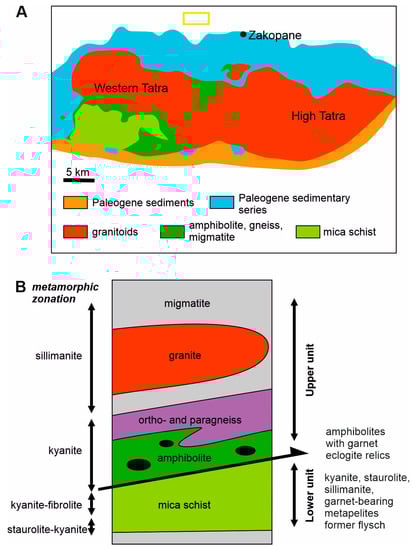 (A) schematic geological map of the Tatra Mountains; (B) simplified succession along the main tectonic units of the Tatra Mountains with respect to lithology and metamorphic zonation (from Janák et al. [78]). The yellow rectangle indicates the sampling area.