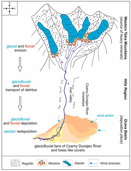 Heavy mineral analysis indicated that material was derived from the Western Tatra Mountains. The primary source of the detritus could be older, pre-Quaternary regolith located in the Western Tatra Mountains. This material was introduced into the glacial and glaciofluvial transport and finally deposited by the Czarny Dunajec River in the Orava Basin (Figure 13). Loess-like deposits in the Orava Basin could be additionally formed under long-term aeolian processes. Sand and silt-sized grains were blown out from their exposed, barren palaeochannels beds during the whole Pleistocene [33]. Different modes of transport may be suggested by the polymodal character of grain-size distribution of the studied sediments [33] (Table 1). According to Smalley et al. [88] and Vandenberghe [89] the source of loess could be locally redeposited alluvial material, primary derived from eroded glacial sediments.