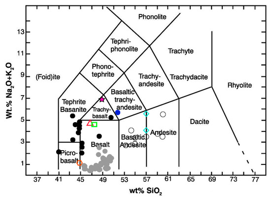 - LeBas, M.J.; Lemaitre, R.W.; Streckeisen, A.; Zanettin, B. A chemical classification of volcanic rocks based on total alkali silica diagram. J. Petrol. 1986, 27, 745–750. [Google Scholar]