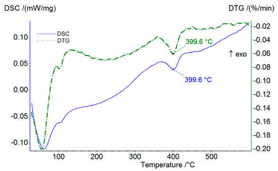 The DSC curve of analcime exhibited one main endothermic peak at about 399 °C (Figure 8), linked to analcime breakdown, in agreement with literature data [75,76]. The endothermic peak can be related to the compensating cation–water binding energies. Analcime dehydrates between 350 °C and 450 °C, as shown in the DTG curve at about 399 °C. The DTG peak occurred as a consequence of the transfer of H2O molecules through the six-member rings during dehydration [28,75]. The DSC peaks below 110 °C are related to the liberation of H2O adsorbed on the samples’ surface. Other phases (unreacted materials, i.e., pyroxene, plagioclase, and olivine) did not contribute to the thermal reaction, due to their high thermal stability [77].