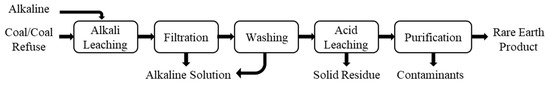 A schematic diagram incorporating the use of the alkali-acid leaching process to extract REEs from coal and coal refuse is shown in Figure 1. A negative aspect of the alkali leaching step is the considerable amount of contaminants dissolved into solution along with the REEs, which complicates the downstream purification process. Another negative aspect is the chemical cost, which will likely be prohibitively high given the relatively low content of REEs in coal-based feedstock. Additional studies need to be performed to investigate the possibility of selectively increasing the REE leachability using diluted alkaline solutions and/or weak alkalis.