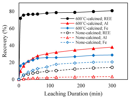 Another advantage of thermal activation is that fewer contaminants are dissolved relative to the REEs. During the calcination process, pyrite began to decompose and was converted to iron oxide (primarily hematite) in the temperature range of 400–500 °C. The crystallinity of hematite increased with the elevation in calcination temperature [21,55,56]. When calcined under high temperature, inter-layered structures of clay minerals, especially kaolinite, were destroyed due to dehydration, resulting in disintegration into thin slices and an increase in surface area [21,57,58]. The overall impact of the mineralogical changes was that Al leachability was noticeably increased, while Fe leachability was slightly increased (see Figure 2). However, as shown in Figure 2 the leaching duration can be shortened to less than 15 min, within which the REE leaching reaction is nearly completed while leaching of Al and Fe is minimal. Therefore, a pregnant leaching solution (PLS) containing relatively higher concentrations of REEs can be produced using the thermal activation-mild acid leaching process.