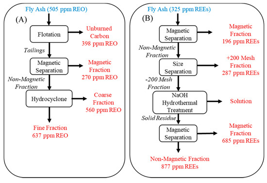 Given these results, physical separation can be used to pre-concentrate REEs from coal combustion ash, thereby providing a higher-grade feed material to the downstream extraction processes (e.g., acid leaching), resulting in a reduction in the overall recovery cost ($/kg of rare earth oxide). In the patents [89,90], magnetic separation was used to produce a feed material for the subsequent acid leaching process. Two physical beneficiation processes are shown in Figure 5. In both circuits, magnetic separation is performed prior to size fractionation, whereas in another study by Pan et al. [87], the sequence is reversed. Therefore, no fixed strategy has been proposed for the physical beneficiation process. The selection of pre-concentration strategy for a specific ash sample should be based on a comprehensive laboratory evaluation of the REE partitioning characteristics.