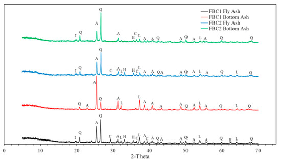 XRD patterns of the fluidized bed combustion (FBC) ash samples: A, anhydrite; C, calcite; H, hematite; I, illite; L, Lime; and Q, Quartz [53].