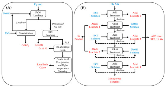 Coal combustion ash was chemically and/or thermally pretreated prior to acid leaching to achieve high REE recoveries [18,26,76,98,100,109]. Lin et al. performed hydrothermal treatment on a coal fly ash and found that 21.3% of the material was dissolved by using 5 M NaOH with a solid/liquid ratio of 1/20 at 100 °C for 120 min [76]. REE content in the solid material was increased from 366 to 803 ppm after hydrothermal treatment, which indicates that REEs present in coal combustion ash remain with the solid residue after the hydrothermal treatment. Wang et al. used an 8 M HCl solution to leach a hydrothermally treated fly ash and achieved a total REE recovery of 88.15% [18]. As shown in Figure 8A, Si, Ga, and Al were also recovered from the fly ash alongside REEs. Ma et al. proposed an alternative NaOH–HCl leaching process, which extracted 55% of REEs, 63% of Si, 72% of Ga, and 78% of Al from the fly ash (see Figure 8B) [98]. Unfortunately, none of the studies produced high-grade final rare earth products.
