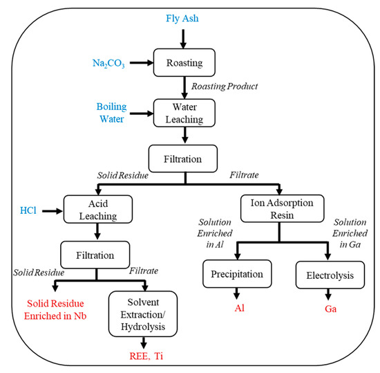 A flowsheet for recovering REEs, Ga, Nb, and Al from a fly ash using alkali roasting [112].