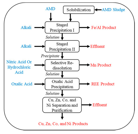 A flowsheet for multiple metals recovery from acid mine drainage (AMD) and acid mine drainage sludge.