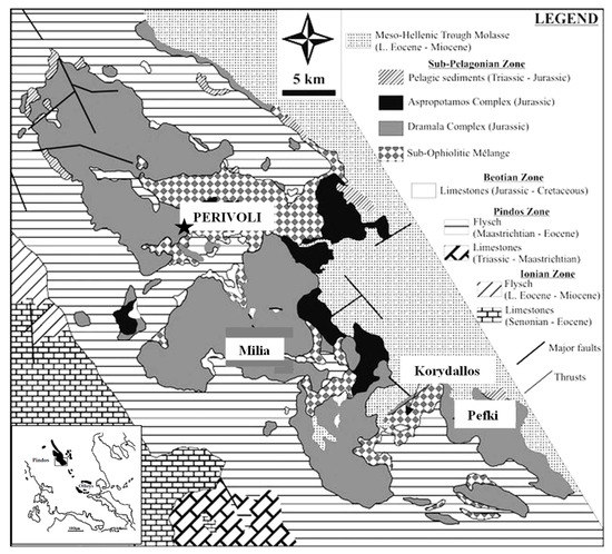 Simplified geological map of the southern part of the Pindos ophiolite, showing the Perivoli (Tsoumes–Kondro) area (modified after [22,24]).