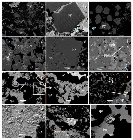 Backscattered electron (BSE) images representative of various morphological forms and textures of pyrite associated with chalcopyrite and sphalerite in a matrix of quartz (a–d); euhedral pyrite displaying erosion and replacement by chalcopyrite–sphalerite intergrowths (b); a close intergrowth between pyrite and bornite (d,e); selenides (clausthalite) as inclusions within bornite (f); fine-grained intergrowths of framboidal or colloform pyrite-bornite, in a matrix of quartz (g,h); replacement of bornite by neo-formed intergrowths of Cu minerals (i–l), which are Cu-enriched and Fe-depleted (Table 1). Scale bar: 200 μm (a); 50 μm (b,f,g,i); 20 μm (e); 10 μm (c,d,h,j,k,l). Abbreviations: py = pyrite; cp = chalcopyrite; sph = sphalerite; bn = bornite; PbSe = clausthalite; qz = quartz; f.py = framboidal forms of pyrite with tiny inclusions of Cu minerals; ge-sp = intergrowths of neo-formed Cu minerals with composition corresponding to geerite and spionkopite.