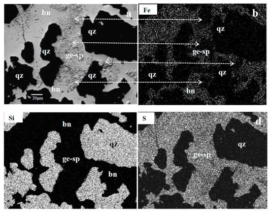 Backscattered electron (BSE)images showing bornite, partially replaced by neo-formed intergrowths of epigenetic minerals resembling geerite or spionkopite, in a matrix of quartz (a) and the single scanning for Fe (b), Si (c), and S (d). White arrows indicate the Fe depletion in the present-day formed intergrowths of high Cu minerals. Symbols, as in Figure 2. Scale bar for b, c, d as in 3a (20 μm)