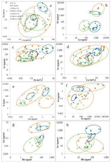 Major and trace elements in massive sulphide ores of Cyprus- and Fe–Cu–Co–Zn-type sulphides from the Pindos ophiolite complex, along with those from comparable ophiolites such as the Othrys and Troodos ophiolite complexes [29,30,31,32,33], are plotted in Figure 6. Although there are overlapping fields, it seems likely that the Pindos sulphides can be distinguished by their higher Zn (Figure 6a,c) and Co (Figure 6b) contents (Figure 6). The highest Se contents were recorded in the Pindos and the Apliki ores (Cyprus) accompanied by Cu and Au contents (Figure 6d,e). A positive trend is also clear between Au and As (Figure 6f).