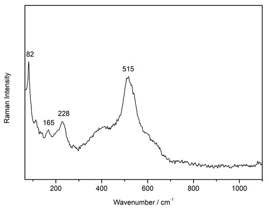 As previously mentioned, the sensitivity of plattnerite when it was irradiated by the laser during Raman analyses was noted, with the formation of lead oxides (red lead, massicot and litharge) during the study of blackening samples from a late gothic mural painting. Therefore, a Raman spectrum of the degradation compound was acquired, keeping the laser power low enough (0.1 mW on the sample) to avoid the formation of secondary products. The characteristic spectrum recorded for the degradation product of the wall paintings (sample FR1) showed the features belonging to scrutinyite at 82, 165 and 228 cm−1 [34], and the most intense band of plattnerite at 515 cm−1, as shown in Figure 1.