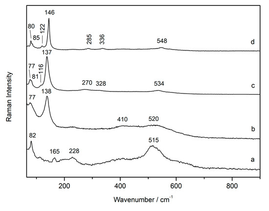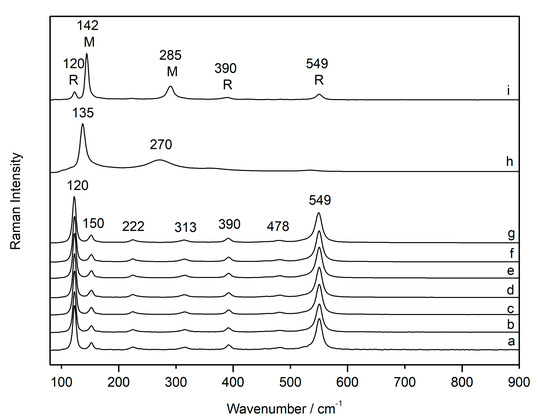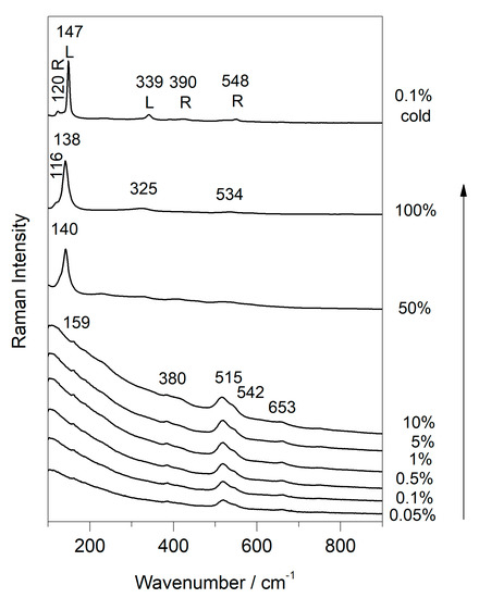 As shown in Figure 8, the spectrum of plattnerite with its characteristic bands was visible up to 10% of the laser power. The temperature increase, due to the effect of the laser between 10% and 50%, was very high, and did not allow the visualisation of the spectrum of the red lead, which generally forms as the first degradation compound. In fact, with 50% laser power, the only well-defined band was that of the massicot (140 cm−1), while the other bands were barely visible and showed a transformation into red lead and massicot. At maximum laser power (100%), the spectrum of the massicot was visible with the bands shifted towards shorter wavelengths (138 cm−1). A band at 534 cm−1 and a shoulder at 116 cm−1 were visible, belonging to the red lead when it was generated as a secondary product of plattnerite. On the other hand, the broad band at 325 cm−1 belonged to litharge, whose main band was probably hidden by the most intense band of the massicot. In fact, since the lead oxides litharge and massicot have the most intense bands close to each other, the main feature of the massicot likely covered that of the litharge.