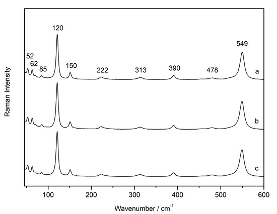 In the sample from the wall paintings (FR1), even the features of α-PbO2—scrutinyite—disappeared with increasing the laser power, and they were not visible in the cold sample analysed at low laser power. In addition, the features at 534 and 116 cm−1 appeared only when red lead was obtained as a degradation product from plattnerite [16]. They did not appear when commercial red lead (sample C-RL1) was analysed under similar conditions of high laser power. In fact, analyses carried out on red lead commercial powder showed that it was nearly insensitive to the laser power with 633 nm radiation, analysed with changing filters between D2, D1 and D0.0 (Figure 3). In this spectrum, all features belonging to Pb3O4 were visible at 52, 62, 85, 120, 150, 222, 313, 390, 478 and 549 cm−1.