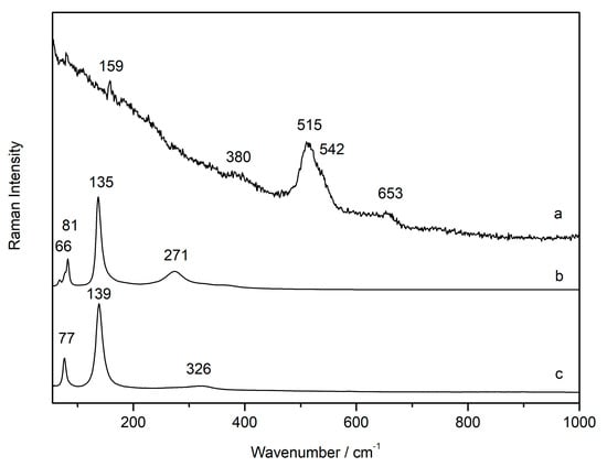 Pure commercial plattnerite powder (sample C-P1) was analysed with the 633 nm laser by changing the power of the excitation light. The Raman spectrum of plattnerite was obtained at low laser power. In these conditions, plattnerite did not undergo phase transformations, showing features at 159, 515 and 653 cm−1 (Figure 5a). The broadening of the main band at about 515 cm−1 may have arisen from small amounts of Pb3O4, having a strong band at 548 cm−1. The temperature increase with increasing laser power caused the growth of a band, assigned to red lead, at about 390 cm−1, and subsequently the appearance of features indicating the formation of lead monoxide litharge (Figure 5c), and then of massicot (Figure 5b). With further increases in the laser power (and temperature), the Raman spectra showed only massicot as the final product of the induced degradation, in agreement with previous studies on plattnerite [16].