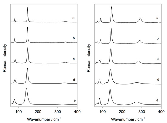 The formed degradation products from plattnerite (massicot and litharge) were also analysed by varying the power of the laser. Their wavenumbers were compared with those of commercial pigments, with the aim of recognising when a degradation of the sample occurs due to the laser. The variations in the wavenumber and width of the massicot and litharge features, at increasing excitation power using the 633 nm laser, were observed only if they were obtained as degradation products of commercial plattnerite (Figure 6). For both, it was evident that the shift of the bands towards lower wavenumbers increased with temperature. The position of the more intense band in massicot varied between 145 and 135 cm−1, while that of litharge varied between 146 and 140 cm−1, as shown in Table 2 and Table 3. When, after laser heating, the sample was irradiated at low laser power, Raman bands narrowed and returned to higher wavenumbers.