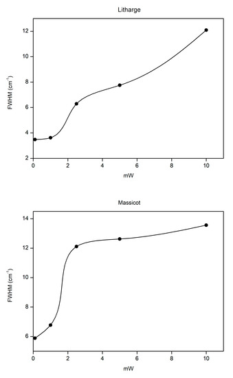 In addition to shifting the Raman bands towards lower wavenumbers, an increase in the band width for both lead oxides was determined as the temperature increased. Figure 7 graphically shows the value of the full width at half maximum (FWHM) of the main band of litharge and massicot, determined by fitting a single Lorentzian curve, as a function of the laser power (Milliwatt) of each filter used, confirming that a directly proportional relationship exists between the two variables. Although the trend of the curve confirms a gradual increase in the width of the band with the increase in laser power for both lead oxides, the widening of the band of litharge was more evident if the spectrum obtained at high temperatures (D0.0) was compared with that recorded on the cold sample, using filter D2. On the other hand, for both lead oxides, a minimal variation in the band width occurred using filters D2 and D1, which correspond to 0.1 and 1 mW, respectively. When the sample was analysed again with low laser power (D2), the value of FWHM corresponded with that previously calculated at the same laser power.