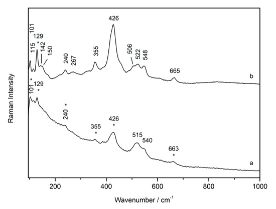 Raman spectrum of plattnerite after heating to 400 and 430 °C degrees in temperature-control stage, and analysed with 0.5% laser power. The asterisks in the spectrum (a) indicate the initial formation of the lead oxide shows in the spectrum (b).