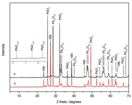 XRD analyses were carried out to identify the intermediate phases that had formed during the heating. Analysis of the plattnerite sample heated to 400 °C (C-P4) allowed us to identify a mixture of tetragonal β-PbO2 and monoclinic Pb12O19 (Figure 10a). On the other hand, analyses of the sample heated to 450 °C (C-P5) showed that the dominant phase was Pb12O19, compared to tetragonal β-PbO2. In addition, the presence of another diffraction peak between 10° and 22° theta, corresponding to a small amount of the lead oxide PbO1.57 monoclinic, was noted (Figure 10b). In the X-ray diffraction pattern, the peaks of potassium bromide (KBr) were present because this was used to make pellets mixed with plattnerite.