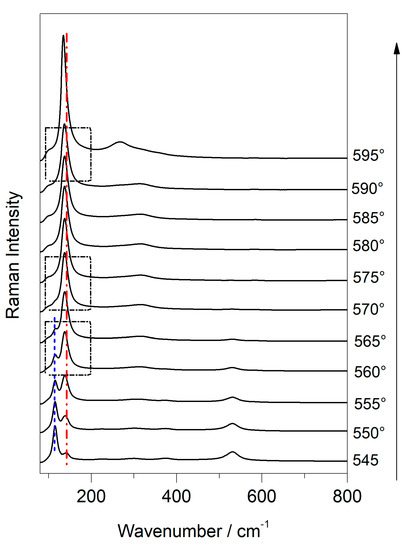 At 540 °C, an increase in the intensity of the band at 145 cm−1 was noticed, and even a gradual shift towards lower wavelengths. Between 550 °C and 555 °C, an inversion of intensity between the two bands at 116 and 140 cm−1 was visible in the Raman spectra in Figure 12. At 560 °C, the transition from red lead to litharge occurred, with the formation of the band at 138 cm−1 and one at 314 cm−1, and only the band at 534 cm−1 from red lead was visible, which lost intensity. In the spectrum collected at 570 °C the red lead bands were not visible, and only the litharge ones were present. Between 590 °C and 595 °C, the phase transition between litharge and massicot occurred, with the formation of the massicot bands at maximum power (at 135 and at 270 cm−1), which remained in that position even at 600 °C. Although the laser power used for the analyses was low (1%), a contribution of the laser to the formation of the secondary products could not be excluded. However, the formation of the massicot between 590 and 595 °C disagrees (5 °C) with what is reported in the literature.