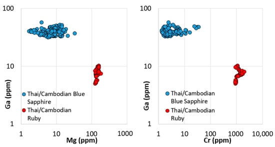 Trace element plots of Thai/Cambodian rubies and sapphires including Mg vs. Ga (left) and Cr vs. Ga (right) plots.