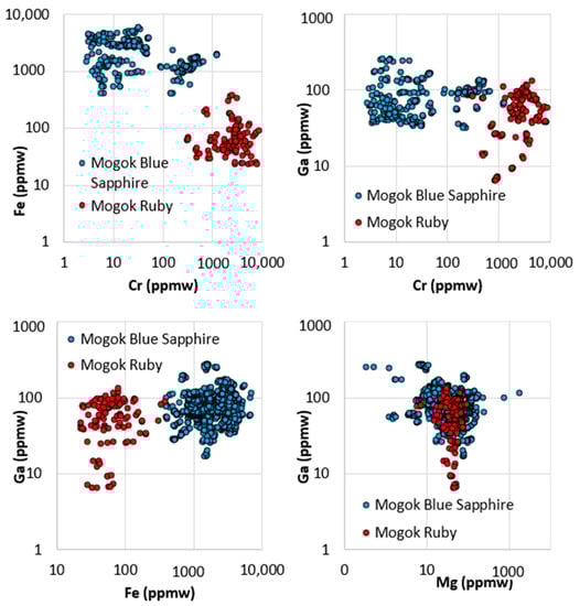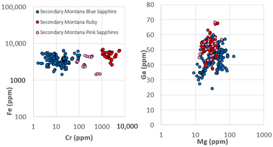 Secondary Montana sapphires are predominantly pastel blue and green with accompanying pink, lavender, yellow, and orange stones. Even rare red rubies have been produced from these deposits, although it is possible that many of these exceptional stones were tragically lost to the tailings piles, as they may have been mistaken for ordinary garnets [22,23]. While the production is dominated by blue and green sapphires, there does seem to be a fairly continuous variation in color from blue and green to pink to lavender to true red. The similarity of the blue and pink sapphires and red rubies is corroborated by their trace element profiles. Except for Cr and V, the ranges and averages of Mg, Ti, Fe and Ga concentrations are essentially the same across the entire color range from blue/green to pink to red (Table 7). Perhaps the most surprising aspect of this is that the trace elements Mg, Ti, Fe and Ga generally vary by one order of magnitude but always less than two orders of magnitude between the blue/green to pink sapphires to red rubies, while Cr varies by more than three orders of magnitude across the full color range. Examination of the trace element plots further explains these trends by showing that Cr concentrations vary continuously from the blue/green to pink sapphires to rubies with little to no variation in other trace elements (Figure 5), whereas trace element plots not involving Cr tend to show complete overlap among the entire range of colored gem corundum from these deposits (Figure 5).