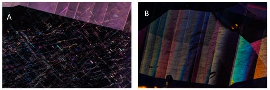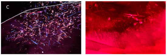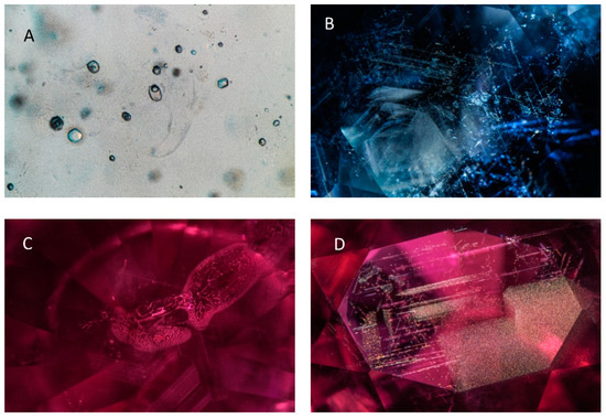Similarly to the case of Thai/Cambodian stones, the differences in geological origin between the Mogok rubies and sapphires can be discerned from their inclusions (Figure 4A–D). Rounded grains of carbonate minerals, apatite, and sulfide minerals are somewhat common in Mogok rubies, while feldspars and zircons and sometimes calcite are occasionally found in the blue sapphires. Mogok rubies are often distinguished by their short, reflective platelet rutile inclusions that can produce vivid interference colors when illuminated with an intense fiber optic light (Figure 4C). However, similar types of inclusions can be seen in the Mogok sapphires (Figure 4A). Longer, non-reflective rutile silk can be found in both types of stones, although it tends to occur in more of a “nested” intergrown arrangement in the rubies (Figure 4D) and is generally more dispersed or arranged in linear or angular bands in some cases in the sapphires. However, the sapphires are frequently characterized by the presence of polysynthetic twinning (Figure 4B).