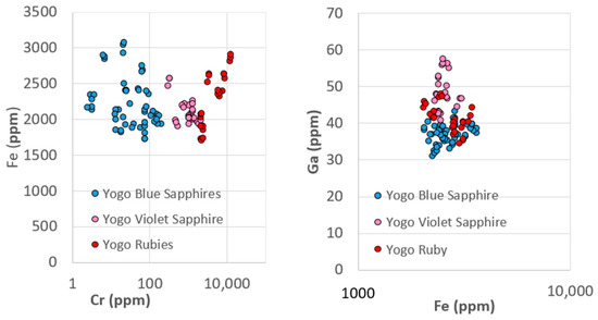 Plots of trace element chemistry of blue and pink sapphires and rubies from Yogo Gulch, Montana, showing their characteristic trace element ranges.