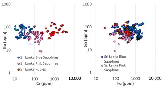 Trace element plots of blue and pink sapphires and rubies from Sri Lanka showing their characteristic trace element ranges.