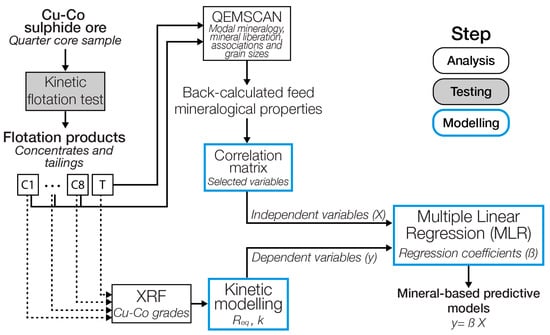 Using quantitative mineralogical data, regression analysis and cross validation, a model is developed that can be used to predict changes in copper and cobalt flotation performance based on in-deposit mineralogical variability. An overview of the methodology is shown in Figure 1. The work in this study can be classified in three categories. The experimental testing with standard operating conditions using nine core samples from different locations in the deposit (1), chemical analysis using pXRF and mineralogical analysis through QEMSCAN for each sample (2) and the modelling phase consisting of kinetics models fitting, using a correlation matrix for variable selection and MLR to quantify the impact of mineralogical parameters on flotation performance parameters (3).