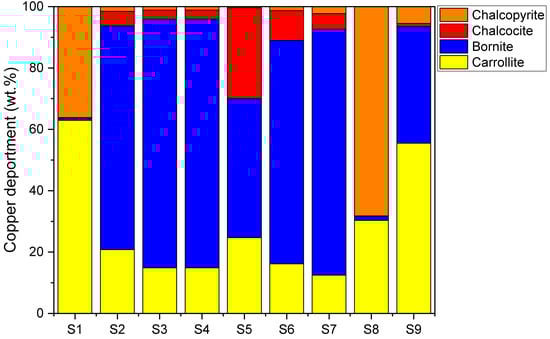 As carrollite is the only cobalt-containing mineral, cobalt recovery is directly related to the recovery of carrollite. For copper recovery, this type of relationship cannot be drawn. When considering Table 2, the quantity and ratio at which the four copper-bearing minerals are found in the samples varies. Using the mineralogical data from Table 2, the copper deportment in the different feed samples can be determined, as presented in Figure 2. For six out of the nine feed samples bornite is the main mineral contributing to the copper content. For sample S1 and S9, carrollite is the dominant mineral contributing to the copper content and for sample S8 that is chalcopyrite. Chalcocite is not the main copper carrying mineral in any of the samples. In sample S5 chalcocite contributes to around a quarter of the total copper content.