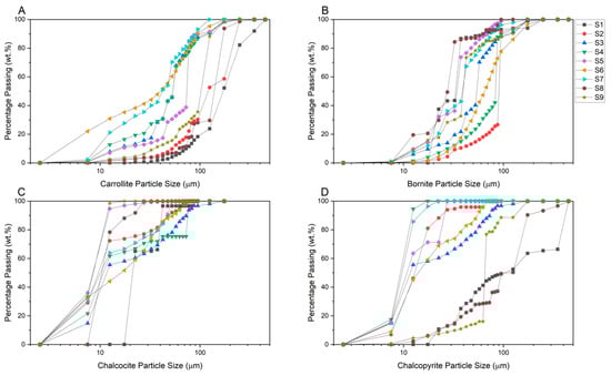 The Particle Size Distribution (PSD) of the target minerals for samples S1 to S9 are shown in Figure 3. It is important to note that in some cases rectangular steps are observed in the data. These are caused by the method through which the particle size data is classified in QEMSCAN data processing software. The PSD will not be smooth if no particles are recorded within that size class. Additionally, the modal mineralogy data from Table 2 needs to be considered when interpreting Figure 3, as negligible mineral content in the feed will mean that the PSD will not provide much information (e.g., bornite and chalcocite in sample S1 and chalcopyrite in samples S4 and S5). The mineral particle sizes vary per mineral and per sample. Sample S1 contains particles of carrollite and chalcopyrite that may not respond to flotation effectively as these will be too coarse [27]. For chalcopyrite, that is also the case for sample S8. There are no samples in which coarse particles of bornite and chalcocite are present. Of the target minerals, chalcocite has the finest particles. When considering the presence of non-valuable minerals (Table 2), it can be seen that the samples with a higher content of silicate minerals (Sample S1 and S8) contain coarser target particles, indicating that the grinding process has been less efficient for these samples.