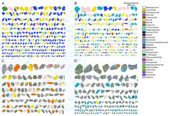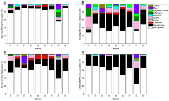Mineral association of the four target sulphide minerals, i.e., carrollite (A), chalcopyrite (B), bornite (C), and chalcocite (D) for all samples.