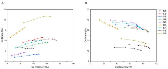 Grade-recovery curves of cobalt (A) and copper (B) for all samples.
