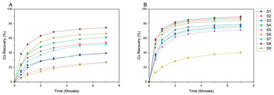 Kinetics curves of cobalt (A) and copper (B) in the rougher stage for all samples.