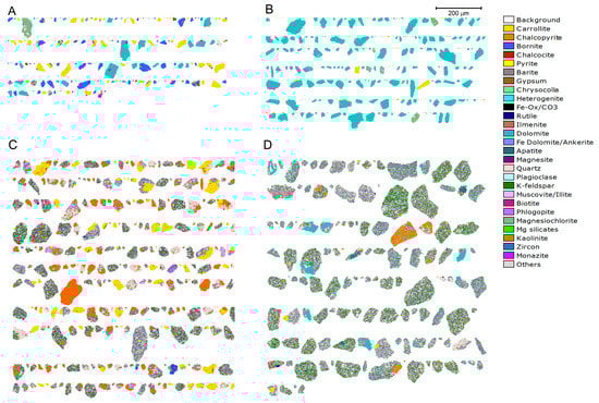 False color QEMSCAN particle mineral maps illustrating flotation concentrates and tailings composition. Typical high grade-low recovery concentrate (A) and associate tailings (B) obtained with sample S6. Typical low grade-high recovery concentrate (C) and associate tailings (D) obtained with sample S8.