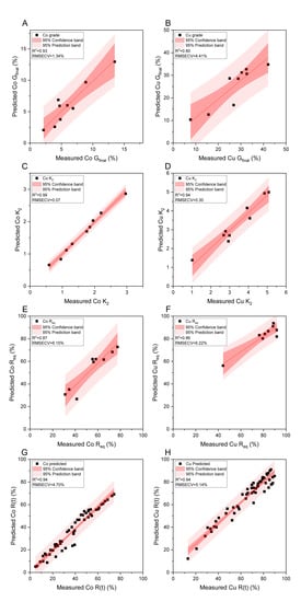 Predicted versus measured values for the Co and Cu final grade (A,B), kinetics model parameters, i.e., rate constant (C,D), equilibrium recovery (E,F) and recovery with time (G,H).