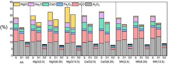 The specific surface area of the samples with metakaolin was lower and there was a decrease with an increasing amount of MK in the mixture. This was probably due to the formation of an amorphous geopolymer phase resulting from the dissolution of a portion of MK in the alkaline activator and its subsequent condensation. The resulting new phase partially blocked the pores. This was the opposite trend compared to CaO and especially MgO where was an increase in specific surface area with increasing amounts of CaO or MgO in the mixture. The increase was most likely due to the formation of hydrated Ca and Mg silicates in the structure of the material. The total pore volume of the AA-S sample (Table 3) was only 0.029 cm3/g. By the subsequent leaching, the total pore volume increased four times to the value of 0.128 cm3/g. The total pore volume of modified D2 samples varied between 0.119–0.268 cm3/g. The greatest increase was observed in CaO samples and in MgO samples. While in the non-treated sample (AA-S) hardly any mesoporosity can be observed, in the modified D2 samples was a considerable increase in the mesopore volume, especially for the CaO and MgO samples. The presence of MgO and CaO in the initial mixture, after acid leaching, plays a significant role in building the mesoporous structure of the material. Ca and Mg are easily extractable by acid and after their removal, additional pores are formed in the structure. By removing Ca and Mg, the aluminosilicate framework is easier to access and aluminum is better removed [20].