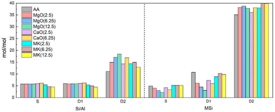 For the D1 samples, there was only a small increase in the MSi parameter and the Si/Al ratio remained almost unchanged. The MSi decrease for the MgO and CaO samples was due to the external addition of MgO and CaO to mixtures that D1 leaching did not remove. In D2 samples, the Si/Al ratio increased two times and the MSi parameter increased up to ten times due to the primary removal of a large amount of sodium and potassium (Figure 2). MgO(12.5)-modified zeolites had the largest increase in Si/Al ratio using 3M HCl. After Mg removal, there was probably more Al available for the acid and therefore easier to remove. A significant increase in Si/Al ratio was also evident in the CaO (6.25)-D2 modified zeolite. There CaO (and also MgO) reacts with the water glass to silicate or to CSH (or MSH in the case of MgO) phase containing wollastonite (CaSiO3 detected in the XRD). The lowest Si/Al ratio had the alkali activated sample (AA) without additionally added compounds. When leaching with 3 M HCl, the MSi parameter increased up to eight times in most modified samples (Figure 2).