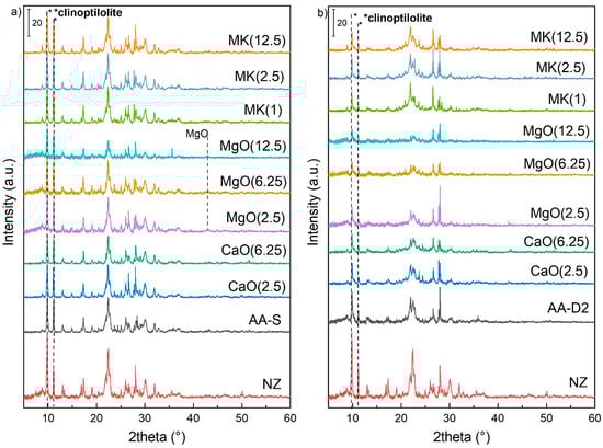 Alkaline activation of natural zeolite (AA) slightly increased the intensity (7%) of the reflection of 11.2° 2θ, [200] due to the higher electron density in a given crystal plane caused by the presence of Na and K cations [13]. On the other hand, AA activation also resulted in an approximately 60% decrease in the intensity of reflection of 9.9° 2θ, [020] (Table 2). In the MgO(2.5)–MgO(6.25) samples, only the low MgO (PDF 65-0476) intensities of the samples at 42.9° 2θ were evident. Diffractograms also showed insignificant intensities associated with the CSH phase (CaO–SiO2–H2O), consisting of wollastonite (PDF 72-2297), resulting from the reaction of CaO with the alkaline activator (sodium silicate). In the MK samples were visible low intensities of mullite (PDF 79-1458) coming from the raw material—metakaolin.