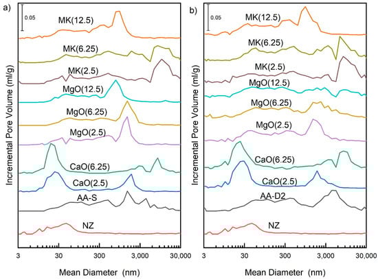 The results of Hg porosimetry showed that all samples contained mesopores (2–50 nm) and macropores (>50 nm). The increase in the mesopore volume was visible in all CaO, MgO, and MK modified samples (Figure 4). The most visible increase of the pore volume in the mesoporous region was in the CaO(2.5) and CaO(6.25) samples (Figure 4a), even in leached samples (Figure 4b). In the case of MgO samples, there was only a slight increase of mesopore volume, but there was a very significant increase in the macropore volume in the 300–3000 nm region. The leaching using 3M HCl caused a decrease of pore volume in the 300–3000 nm region. Significant increases in the macropore volume in the region from 3000 nm were in MK(2.5) and MK(6.25) samples both before and after leaching.