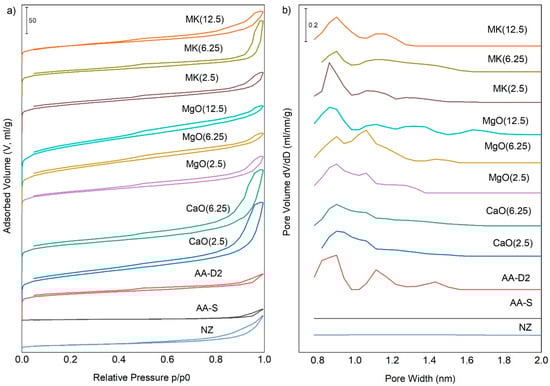 N2 physisorption is the most common technique for studying the surface area and size of mesopores and micropores in zeolites. The shape of the adsorption and desorption isotherm is important to obtain information on whether mesopores are present in the sample and what their shape is [16]. According to the International Union of Pure and Applied Chemistry (IUPAC) classification, we have identified the type of isotherm and thus the nature of the adsorption process. Thanks to the classification, it is possible to distinguish six types of isotherms for gas/solid equilibria [17]. The curves for the N2 adsorption and desorption of D2 samples are presented in Figure 5a. The sample AA-S, which had very low mesoporosity and no micropores gave a type IV isotherm, while after the formation of mesopores and micropores and (in the case of modified D2 samples) a combination of type I and IV isotherms was observed. In the modified D2 samples, the presence of a hysteresis loop was evident, which indicates the occurrence of mesopores. Depending on the shape of the hysteresis loop, it is also possible to determine the shape of the mesopores [16]. IUPAC recommends dividing hysteresis loops into four types. In the CaO(2.5)-D2 and CaO(6.25)-D2 samples the type H3 of hysteresis was observed. The type H3 of hysteresis loop occurs with aggregates of plate-like particles, which lead to the formation of slit-shaped pores [18]. The MgO and MK modified samples showed the type H4. Type H4 loop is generally related to narrow slit-like pores [18]. Most isotherms showed so-called low-pressure hysteresis—open isotherm (Figure 5a). This hysteresis can be caused by several different effects. Most often this type of hysteresis is caused by a change in the adsorbent volume by ‘swelling/inflating’ the pores in flexible or not rigid materials. Another cause may be irreversible adsorption of adsorptive molecules in pores of a size comparable to that of adsorptive molecules. The reason may also be insufficient steady state equilibrium if desorption and adsorption are significantly slowed by difficult diffusion of molecules through structural pores, especially in the area of microporosity [19].